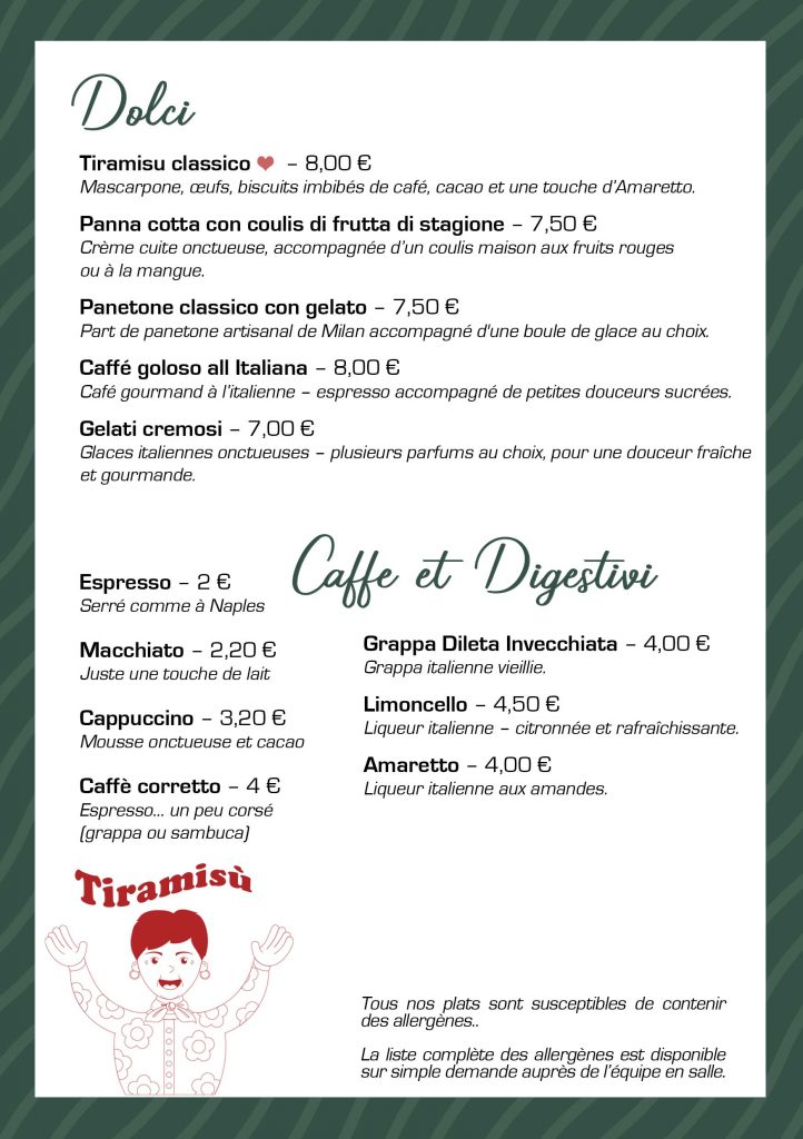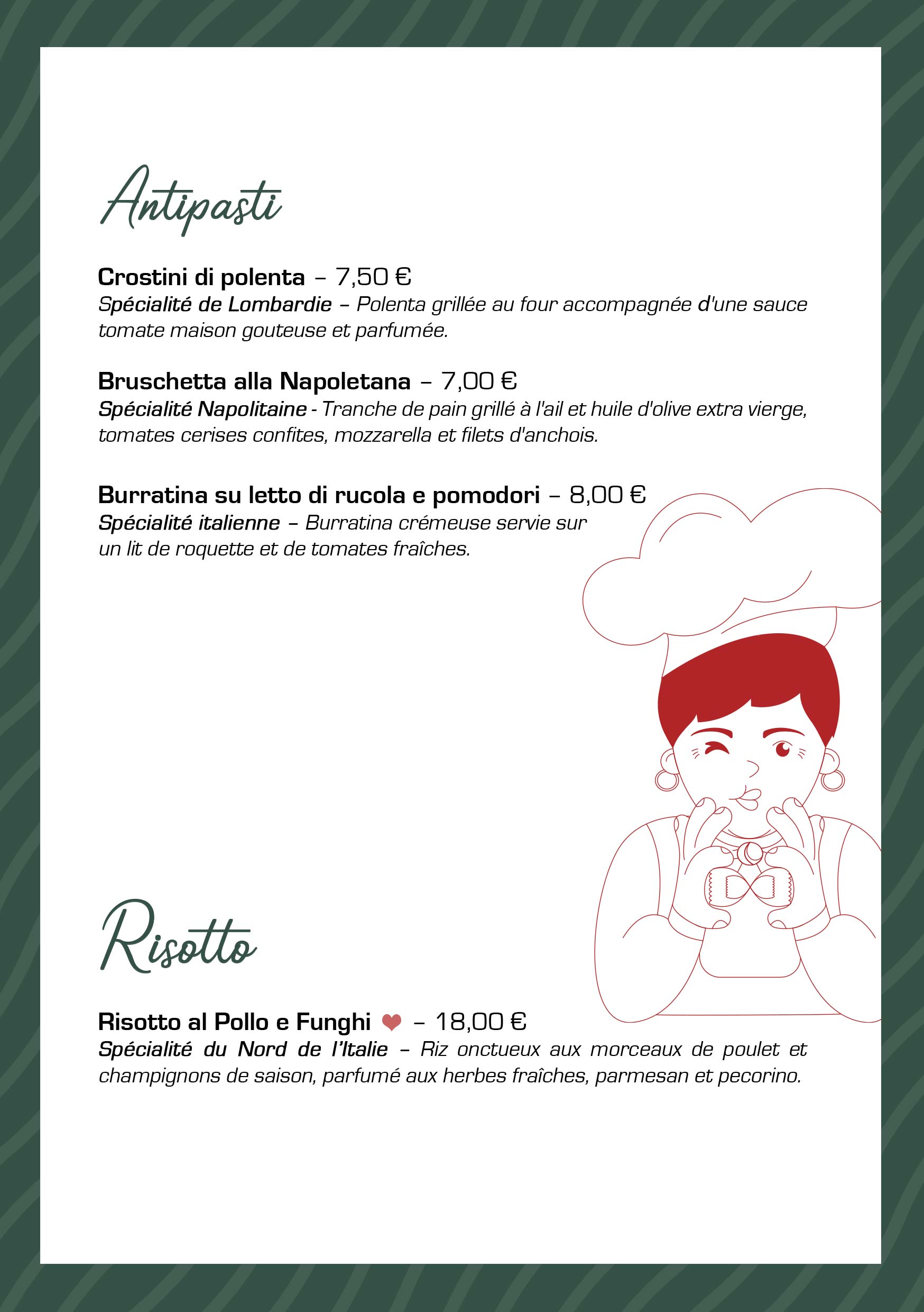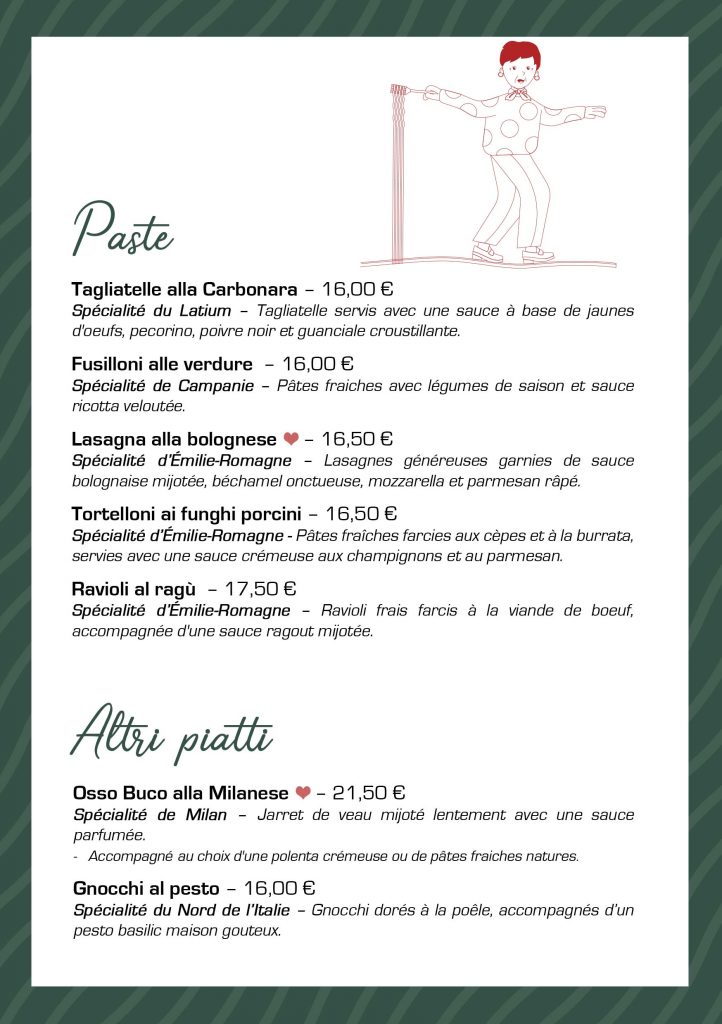 Risotti, lasagnes, osso buco, tiramisu… chaque plat rend hommage aux saveurs de l’italie, dans une trattoria où il fait bon s’attabler, partager, et prendre le temps.